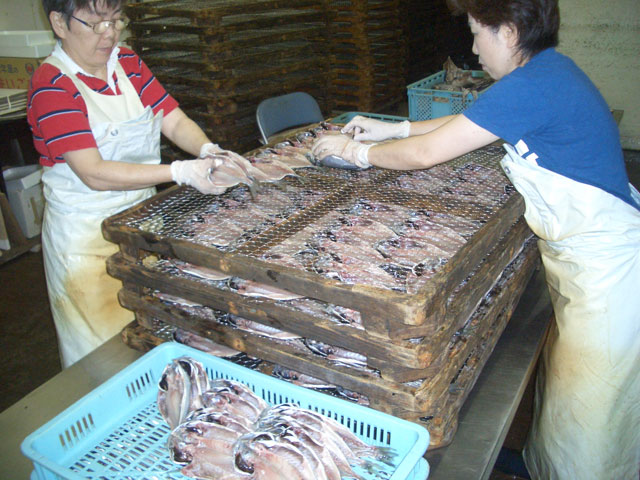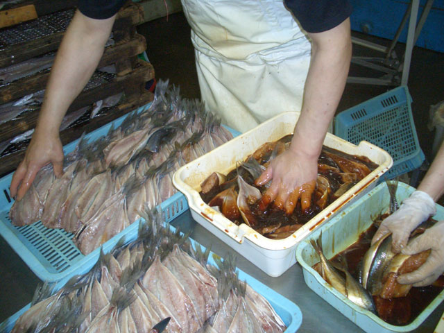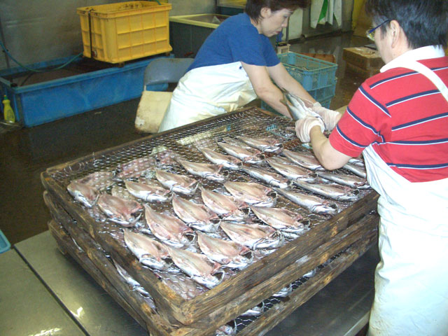ミツダ水産のスタッフが丹念に手作りで干物を製造しております。