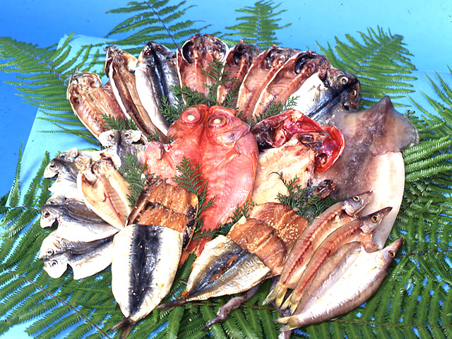 エボダイ、ムロアジ、マアジ、サバミリン、アジミリン、カマス、イカ、サンマミリン、タチウオ、イワシミリン、釜揚げしらす、いかの塩辛など。脂ののったおいしい干物を豊富に品揃え。